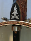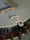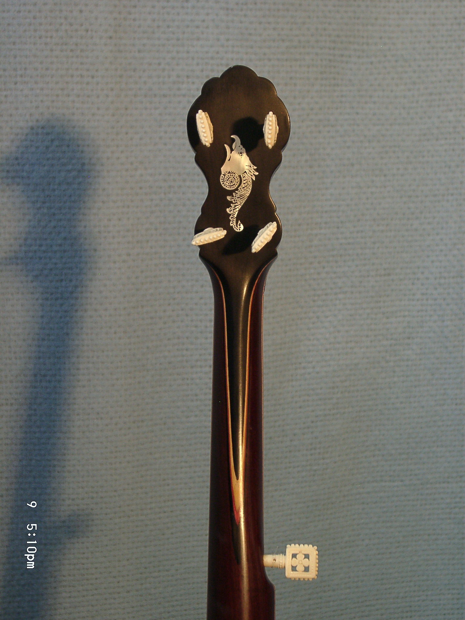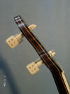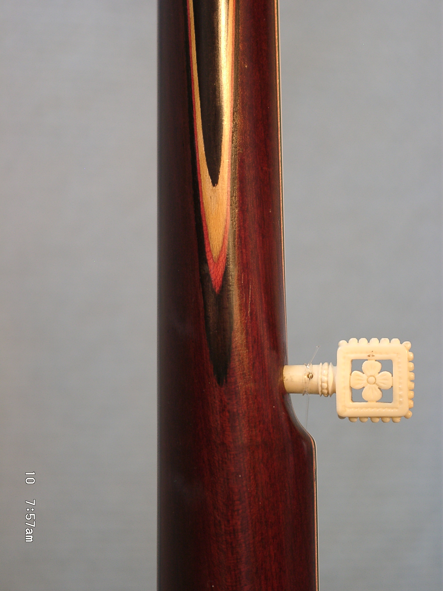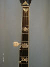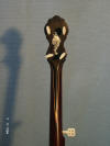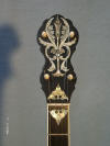 Features of this model: Many features are present on almost every No. 5 or No. 6. Mahogany necks of 1 piece construction that are thin and dainty and have a 27" scale. Ebony caps on the peghead and heel and a long ebony back strap with a pointed end. The peghead is inlaid with an elaborate torch and feathers design and an inverted twin of the first fret inlay. Back strap inlay is a griffin that is often skimpily engraved and the heel inlay is crest shaped. Under the fingerboard and all 3 caps are multiple decorative veneers one of which is red. Board inlays are plentiful, sizeable, and well engraved. Long decorative metal stick cover and long ball-end nuts.