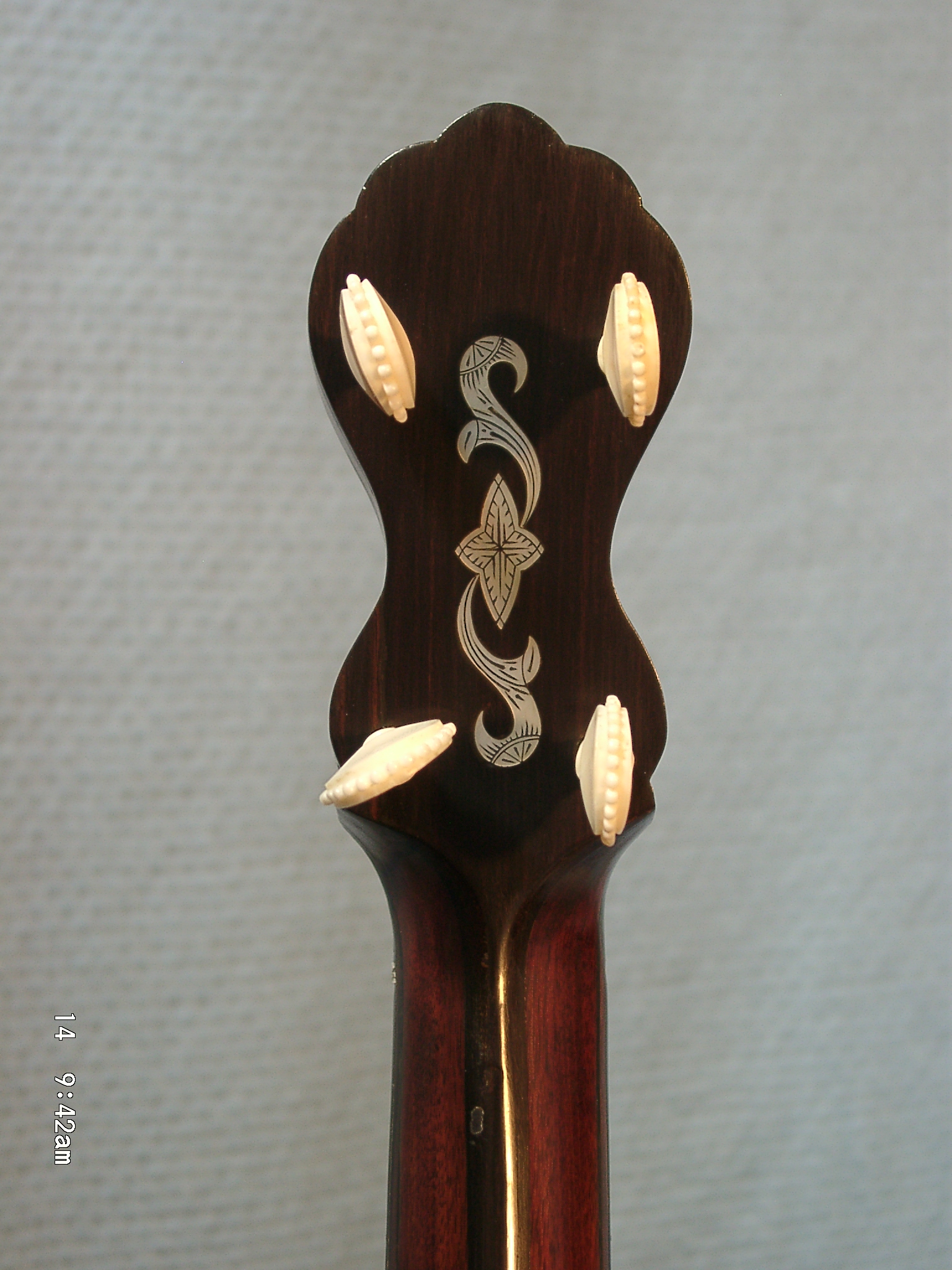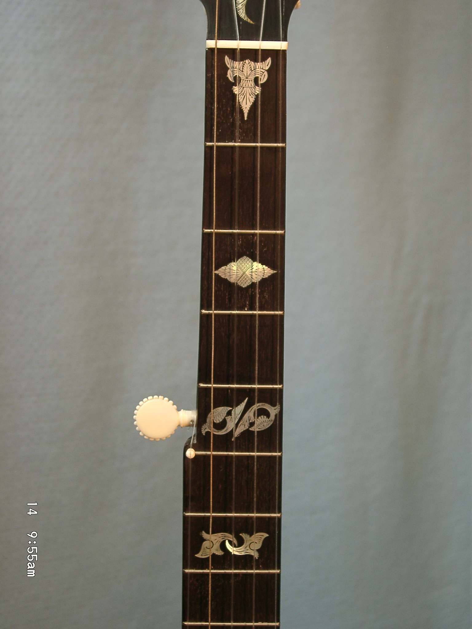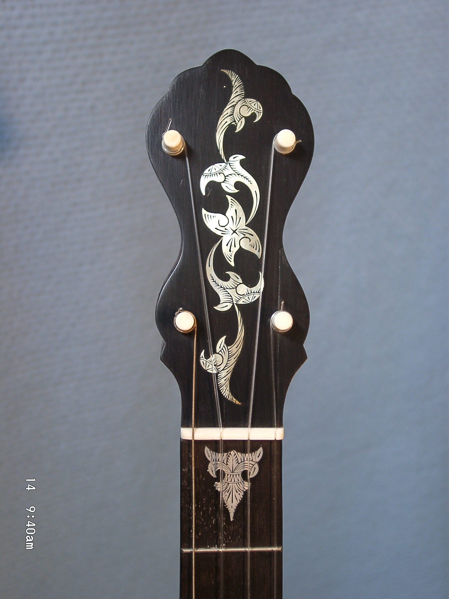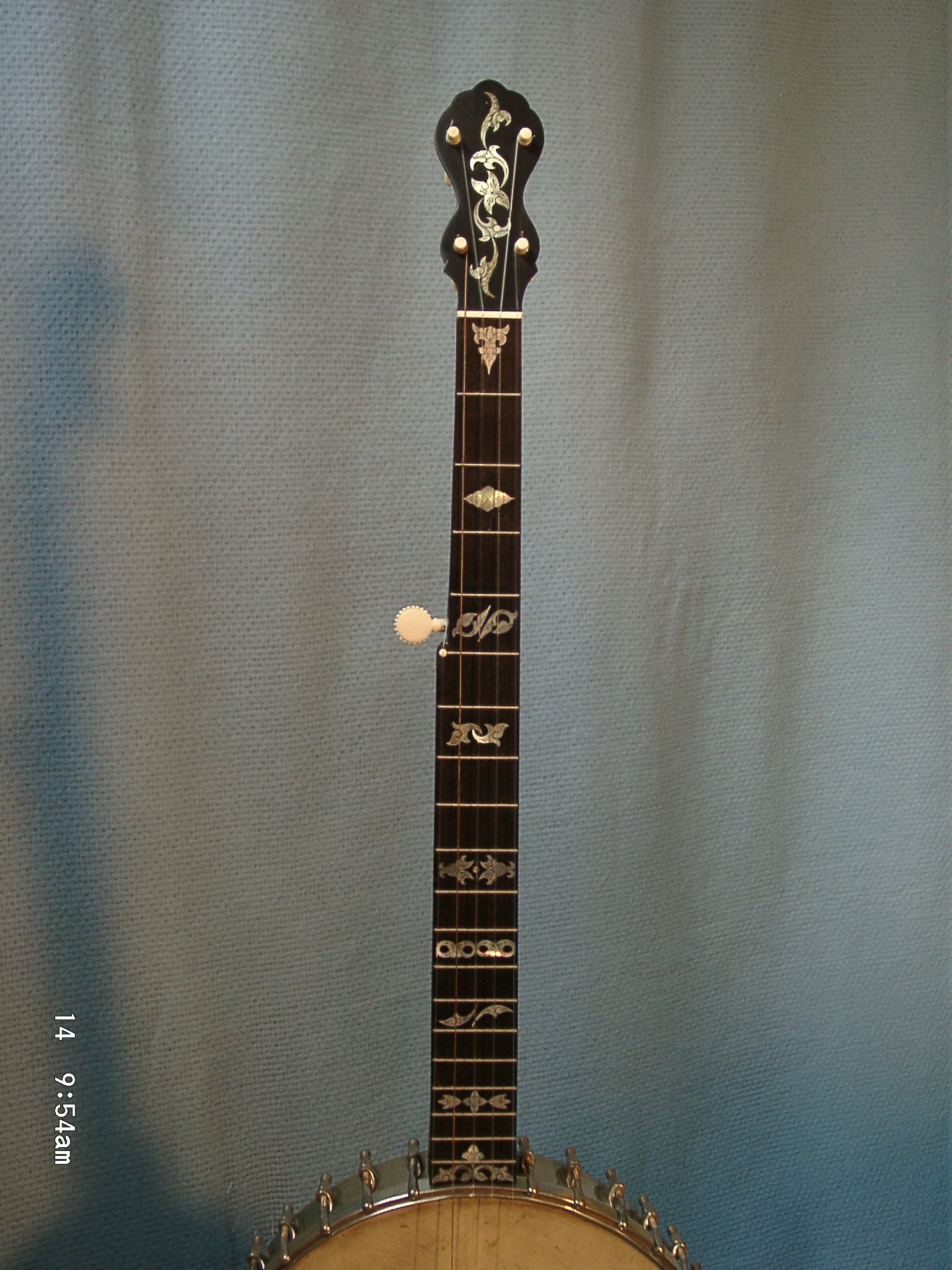 Background: Presumably throughout the Fairbanks era, customers could request banjos made to suit their specific wishes. The most elaborate of those are called Presentation Grade. Somewhat less elaborate instruments made for personal requests are referred to as Custom Grade. Even sub-Electric instrument models could possibly have been ordered but the vast majority were Electrics. Probably there are no 2 exactly alike as they were made to "scratch the itch" of the individual purchaser. For obvious reasons, people willing to pay extra for these banjos usually requested very desirable features. Among other things these could have included special carvings, engraved pots and/or cobra hooks, unusual inlays, different neck woods or veneers, preferred scale length and rim diameter, etc. With the costs and craftsmanship of that era, oh how I wish my grandfather had ordered a dozen or so and just let his imagination run wild ! Survivors are quite rare, all are fascinating, and nearly all are "in benevolent bondage to Bollman in Boston."