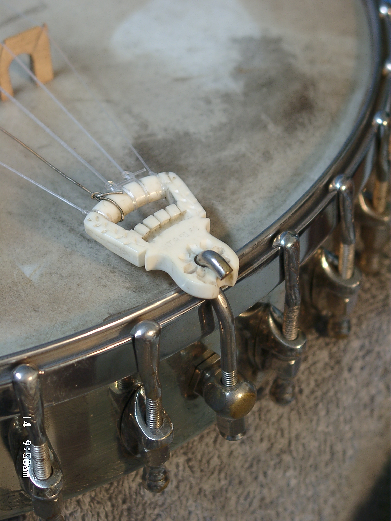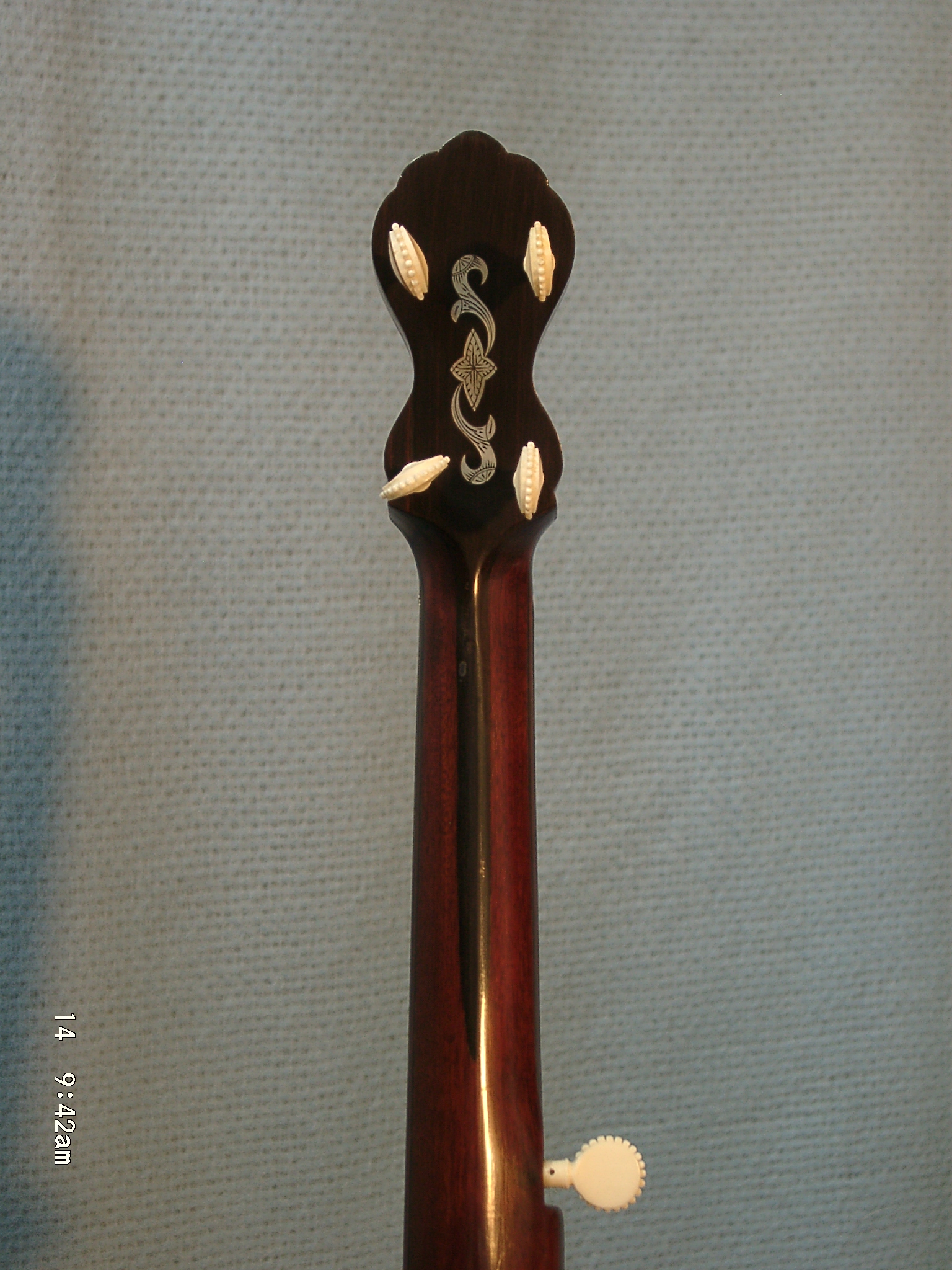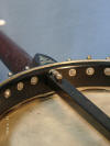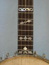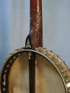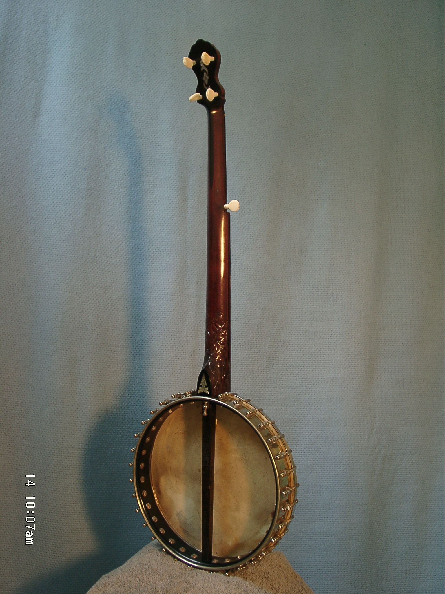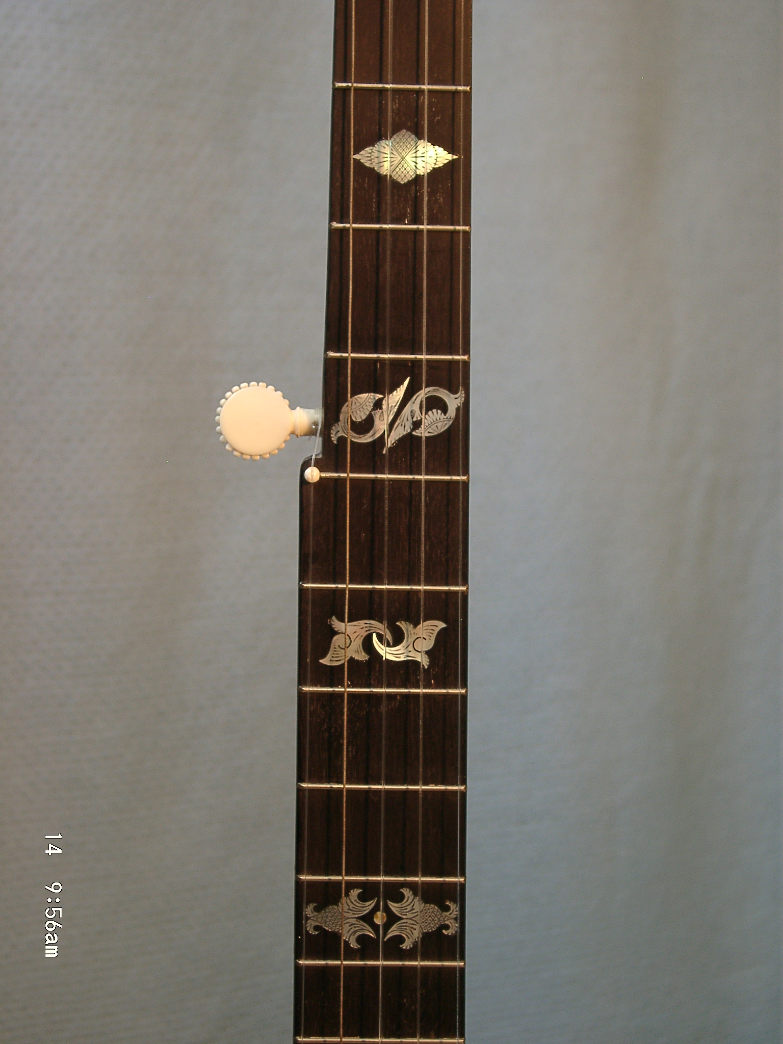 Background: Presumably throughout the Fairbanks era, customers could request banjos made to suit their specific wishes. The most elaborate of those are called Presentation Grade. Somewhat less elaborate instruments made for personal requests are referred to as Custom Grade. Even sub-Electric instrument models could possibly have been ordered but the vast majority were Electrics. Probably there are no 2 exactly alike as they were made to "scratch the itch" of the individual purchaser. For obvious reasons, people willing to pay extra for these banjos usually requested very desirable features. Among other things these could have included special carvings, engraved pots and/or cobra hooks, unusual inlays, different neck woods or veneers, preferred scale length and rim diameter, etc. With the costs and craftsmanship of that era, oh how I wish my grandfather had ordered a dozen or so and just let his imagination run wild ! Survivors are quite rare, all are fascinating, and nearly all are "in benevolent bondage to Bollman in Boston."