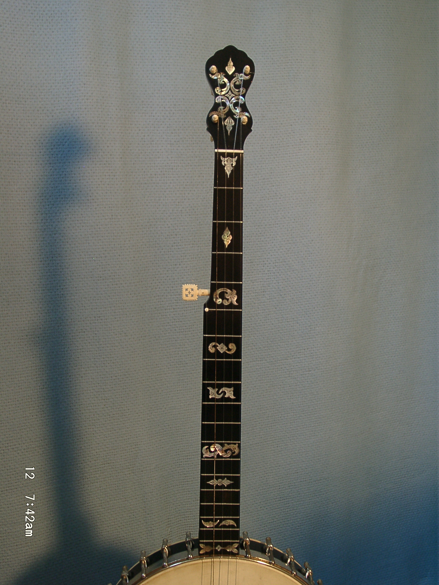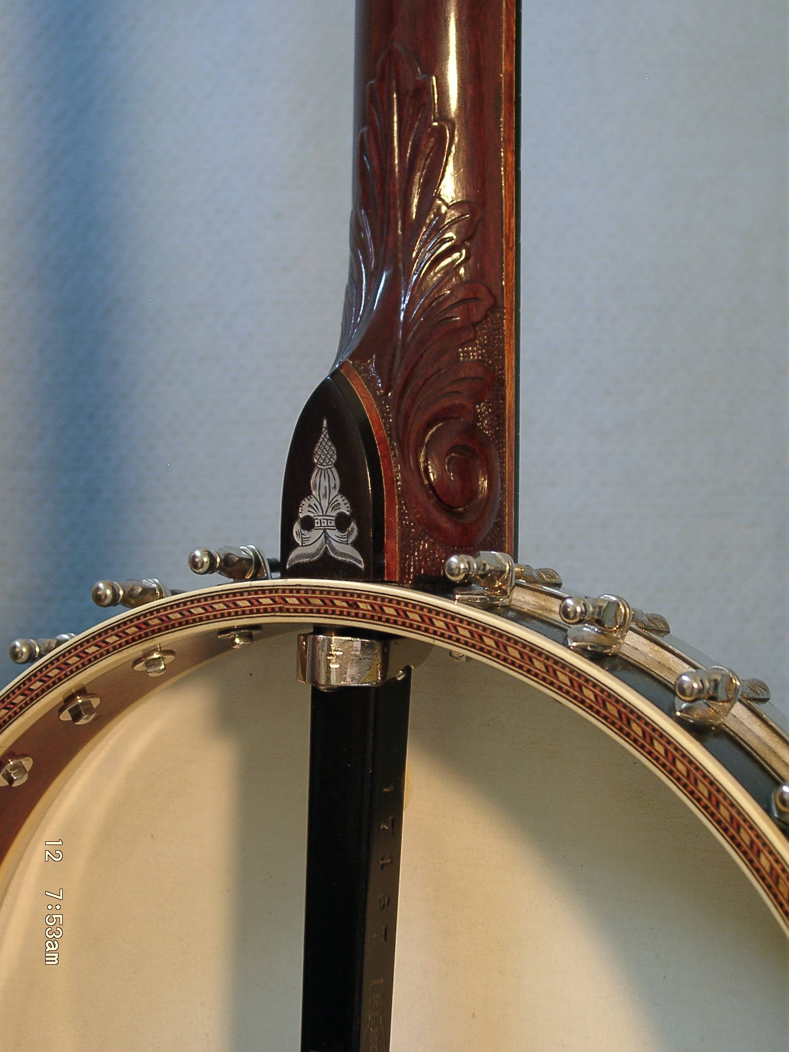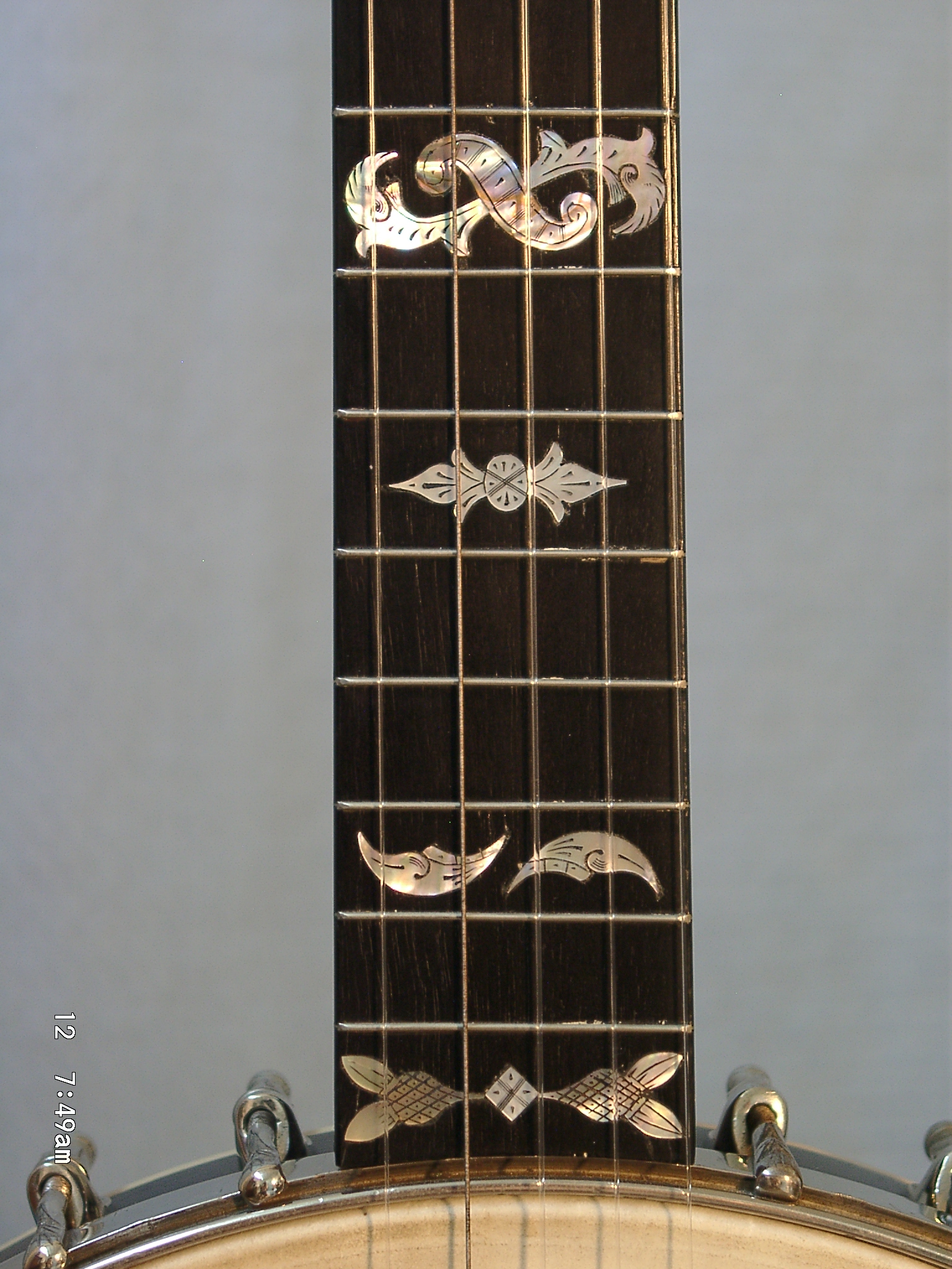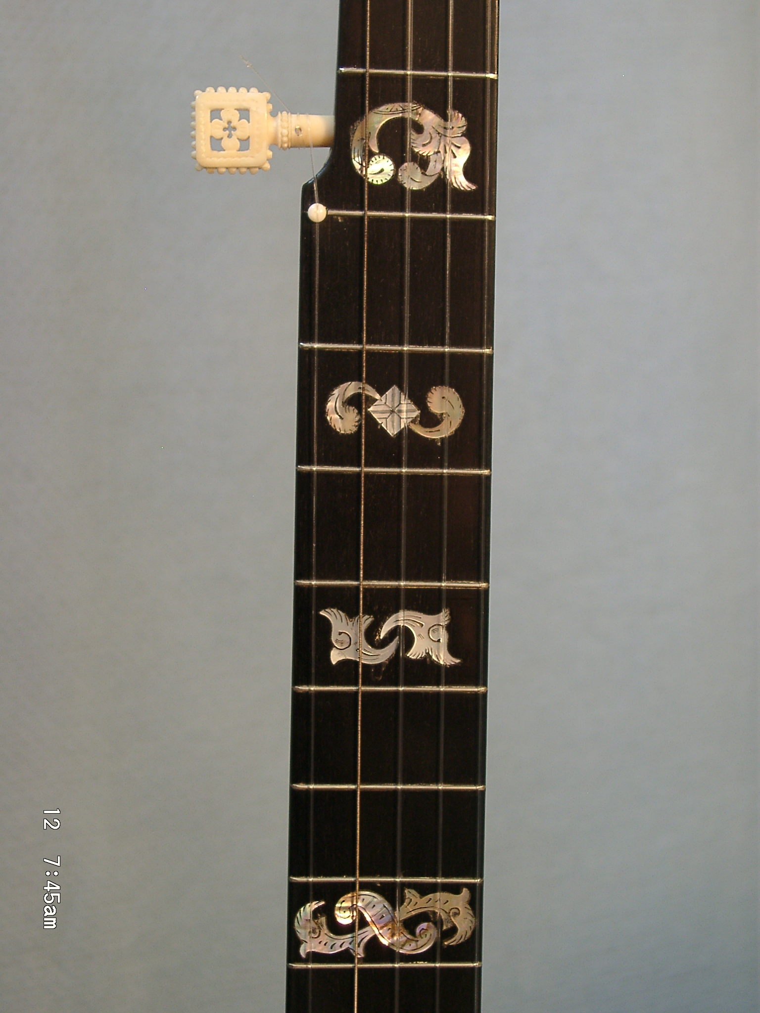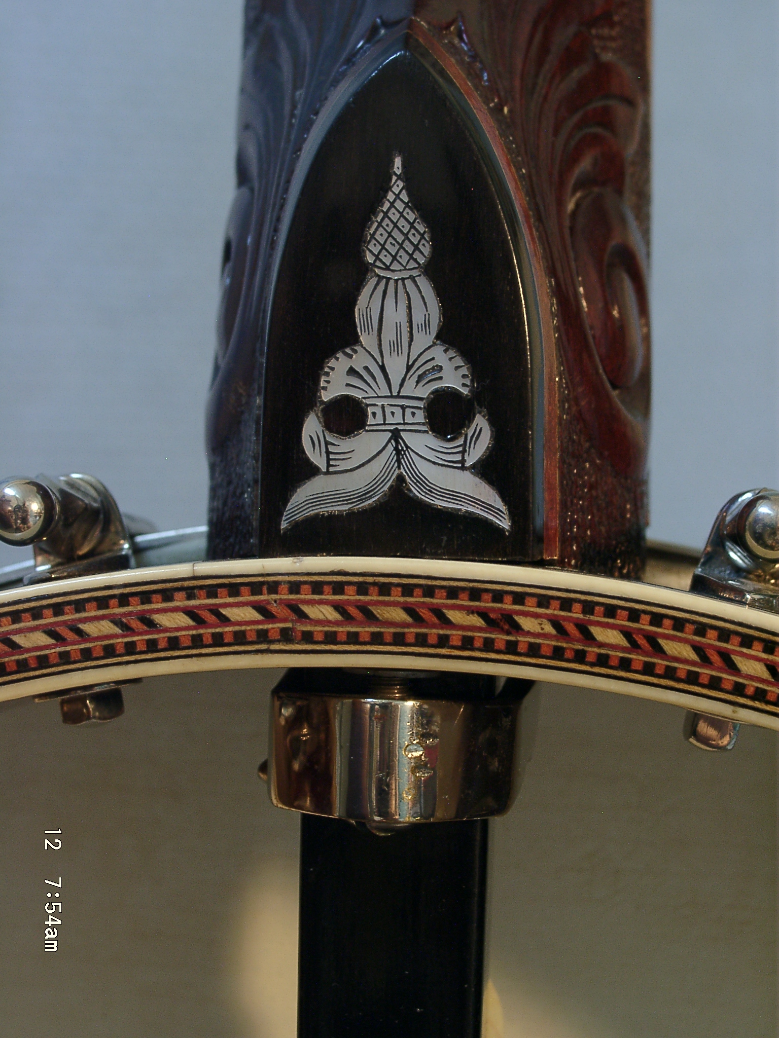 Background: Presumably throughout the Fairbanks era, customers could request banjos made to suit their specific wishes. The most elaborate of those are called Presentation Grade. Somewhat less elaborate instruments made for personal requests are referred to as Custom Grade. Even sub-Electric instrument models could possibly have been ordered but the vast majority were Electrics. Probably there are no 2 exactly alike as they were made to "scratch the itch" of the individual purchaser. For obvious reasons, people willing to pay extra for these banjos usually requested very desirable features. Among other things these could have included special carvings, engraved pots and/or cobra hooks, unusual inlays, different neck woods or veneers, preferred scale length and rim diameter, etc. With the costs and craftsmanship of that era, oh how I wish my grandfather had ordered a dozen or so and just let his imagination run wild! Survivors are quite rare, all are fascinating, and nearly all are "in benevolent bondage to Bollman in Boston."