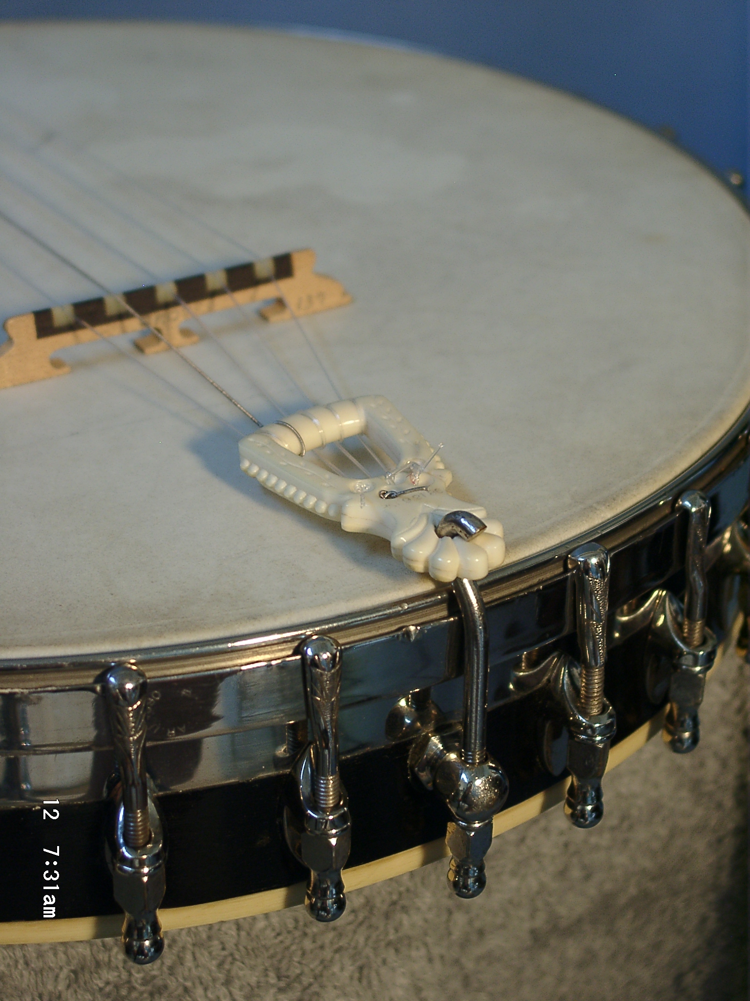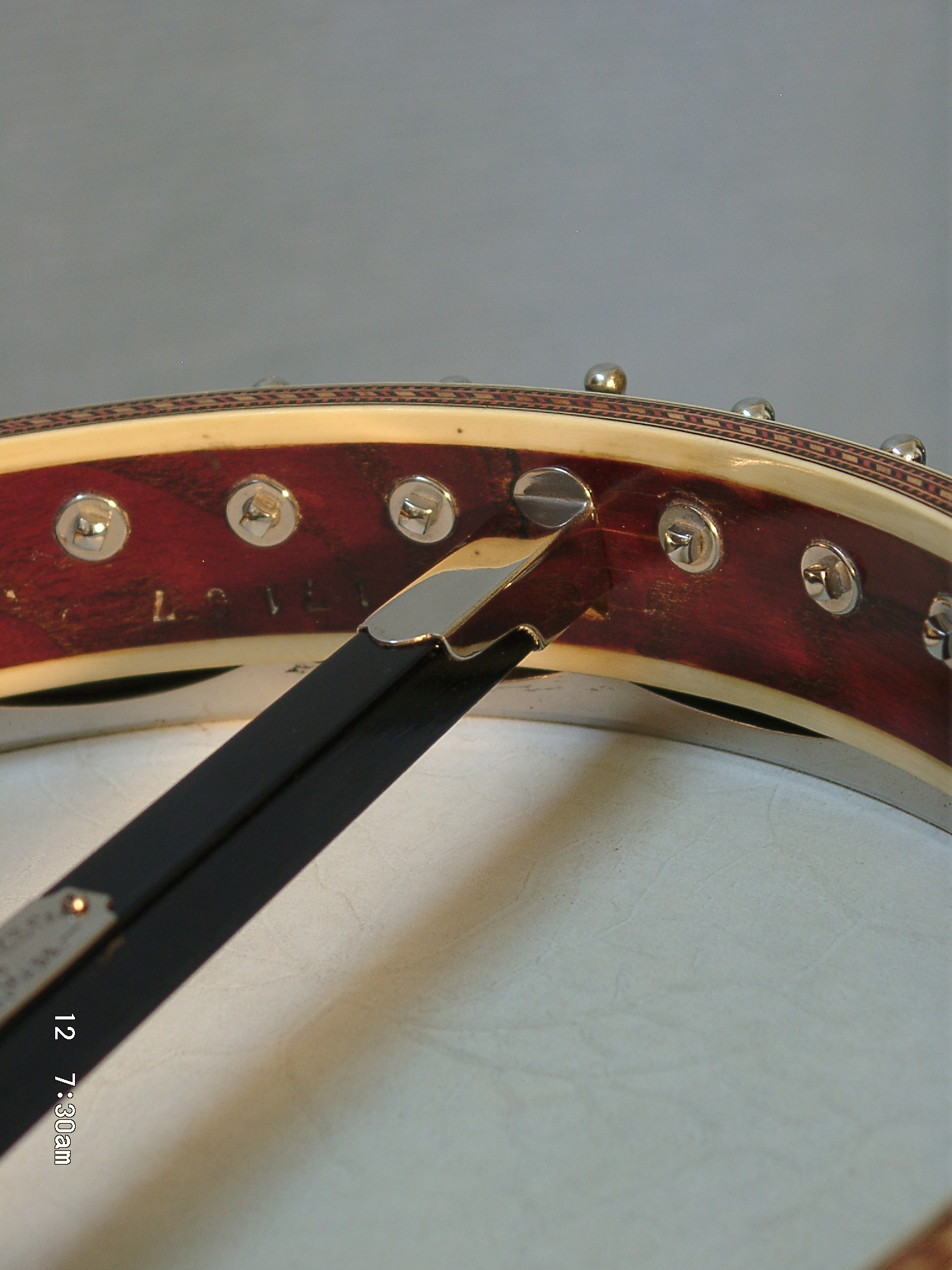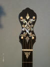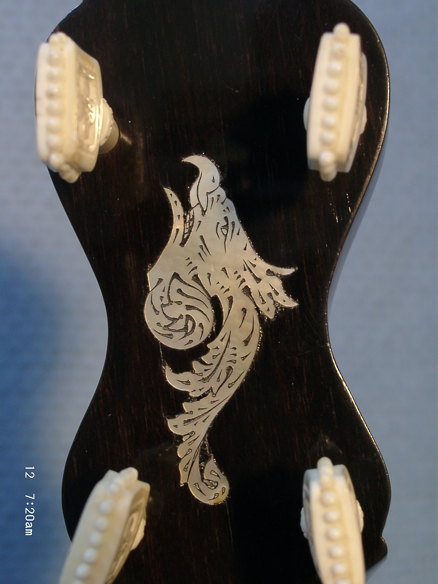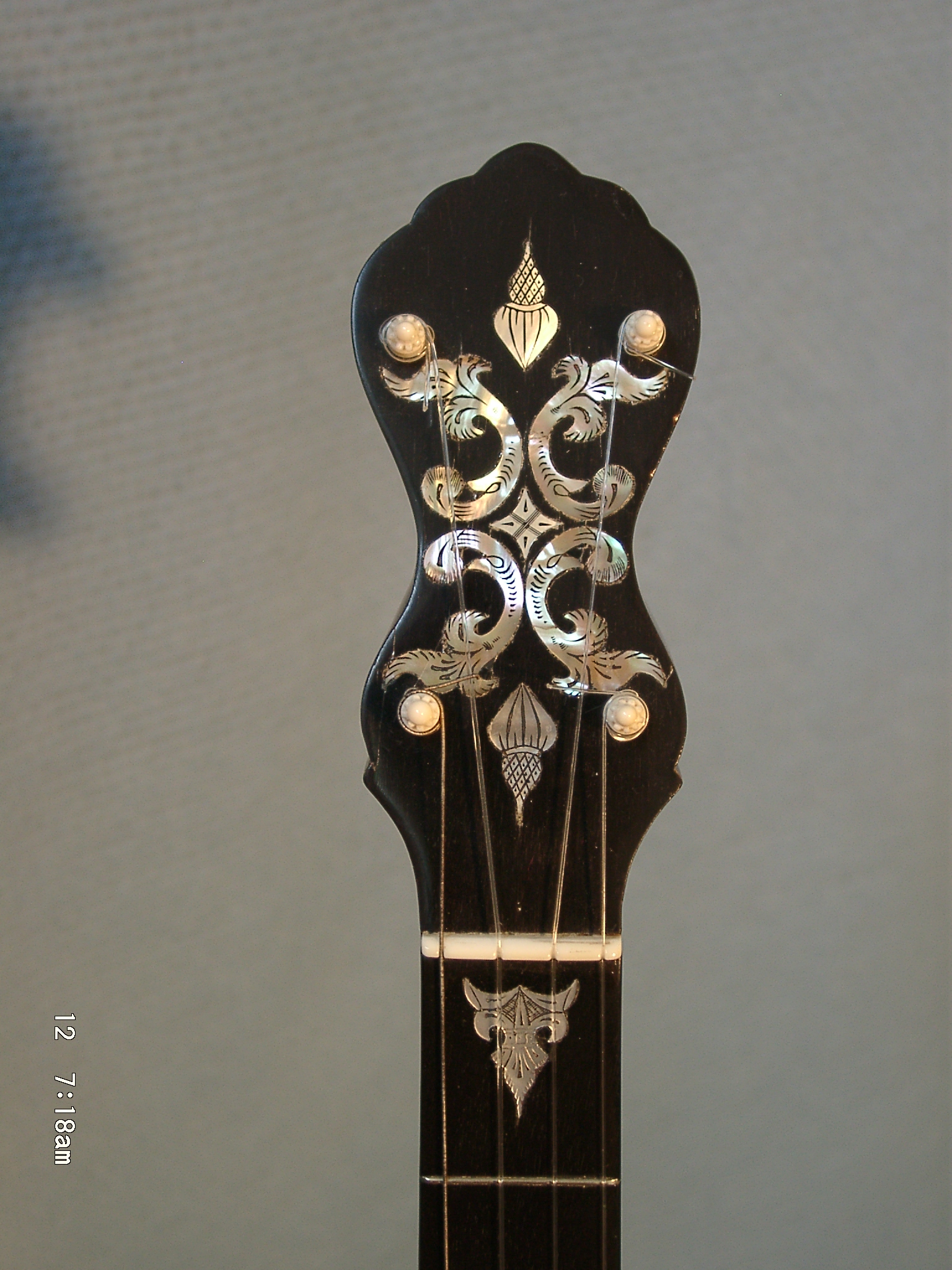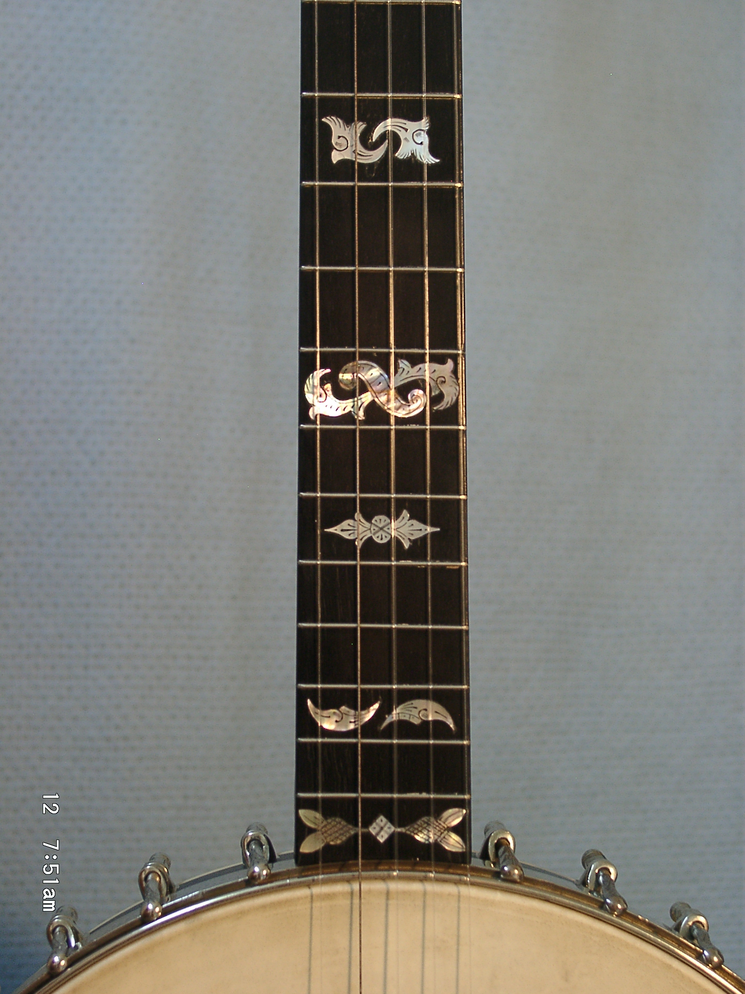 Background: Presumably throughout the Fairbanks era, customers could request banjos made to suit their specific wishes. The most elaborate of those are called Presentation Grade. Somewhat less elaborate instruments made for personal requests are referred to as Custom Grade. Even sub-Electric instrument models could possibly have been ordered but the vast majority were Electrics. Probably there are no 2 exactly alike as they were made to "scratch the itch" of the individual purchaser. For obvious reasons, people willing to pay extra for these banjos usually requested very desirable features. Among other things these could have included special carvings, engraved pots and/or cobra hooks, unusual inlays, different neck woods or veneers, preferred scale length and rim diameter, etc. With the costs and craftsmanship of that era, oh how I wish my grandfather had ordered a dozen or so and just let his imagination run wild! Survivors are quite rare, all are fascinating, and nearly all are "in benevolent bondage to Bollman in Boston."