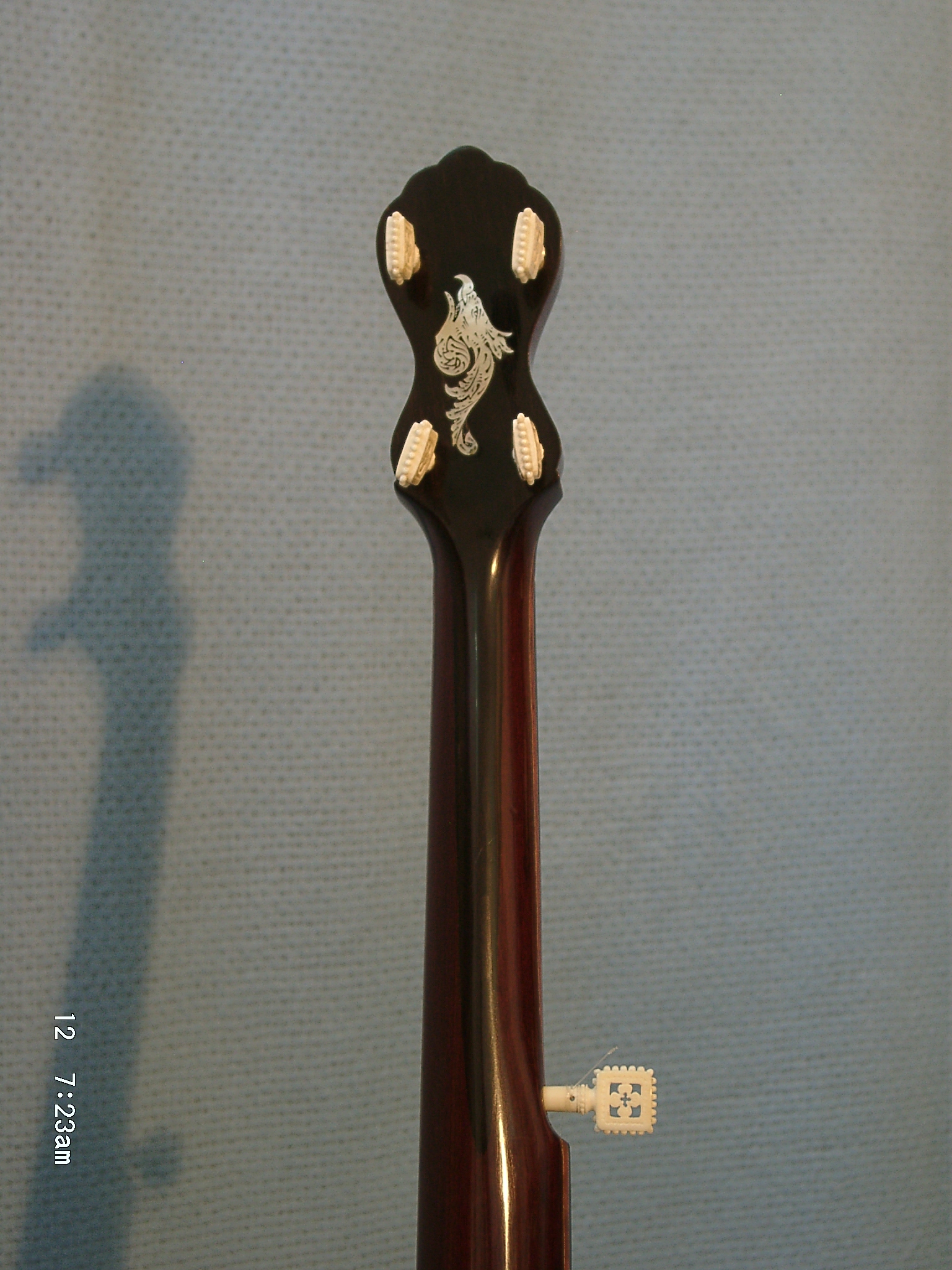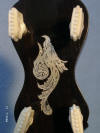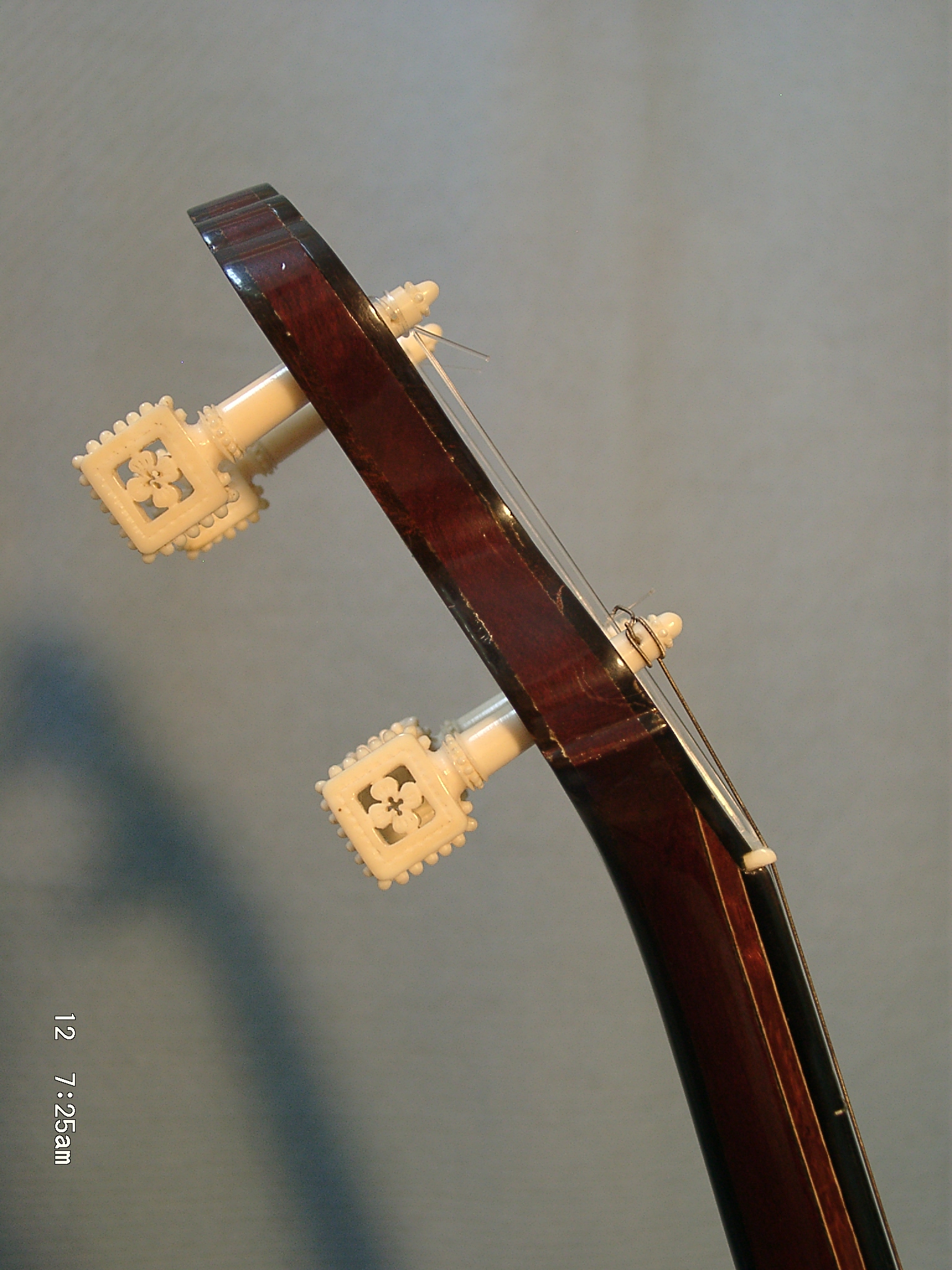 10) Very elaborate carved ivory tuners and elongated ivory tailpiece.