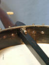 Background: After the split, Fairbanks chose to continue some Fairbanks & Cole models of which this Expert is an example ( this collection also includes a Fairbanks & Cole example). I have no idea how long they were made and in what numbers and am not aware of another example. The dowel stick is stamped “Fairbanks & Cole” but the banjo’s characteristics clearly show it to be made by Fairbanks soon after he recycled the serial numbers. It was made just at the time period when saw-cut inlays were starting to be engraved.