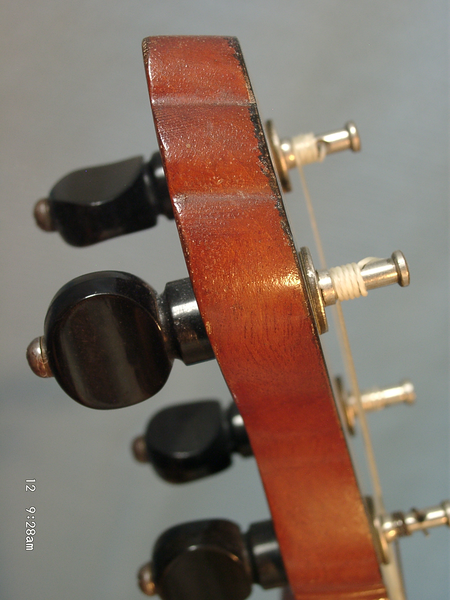 3) The tuners are early metal shafts with black knobs with very big